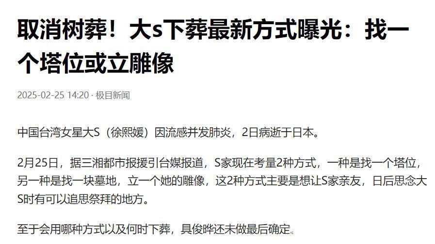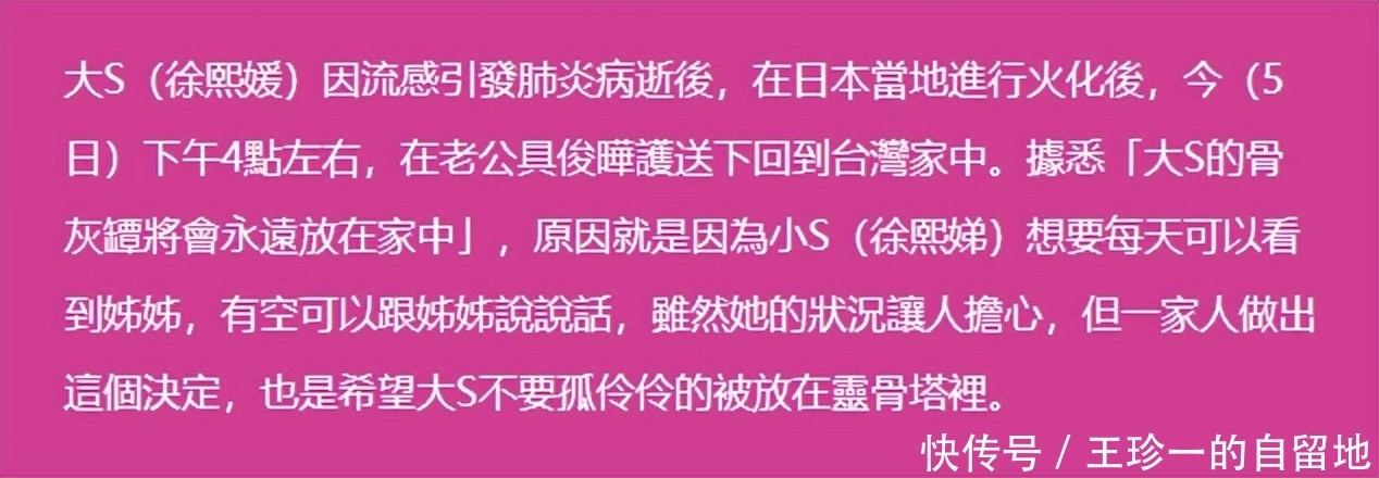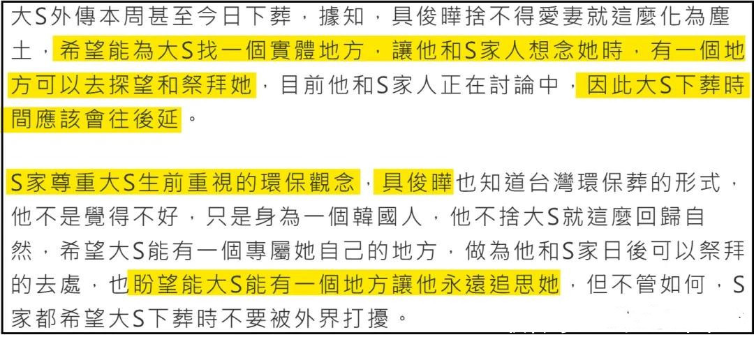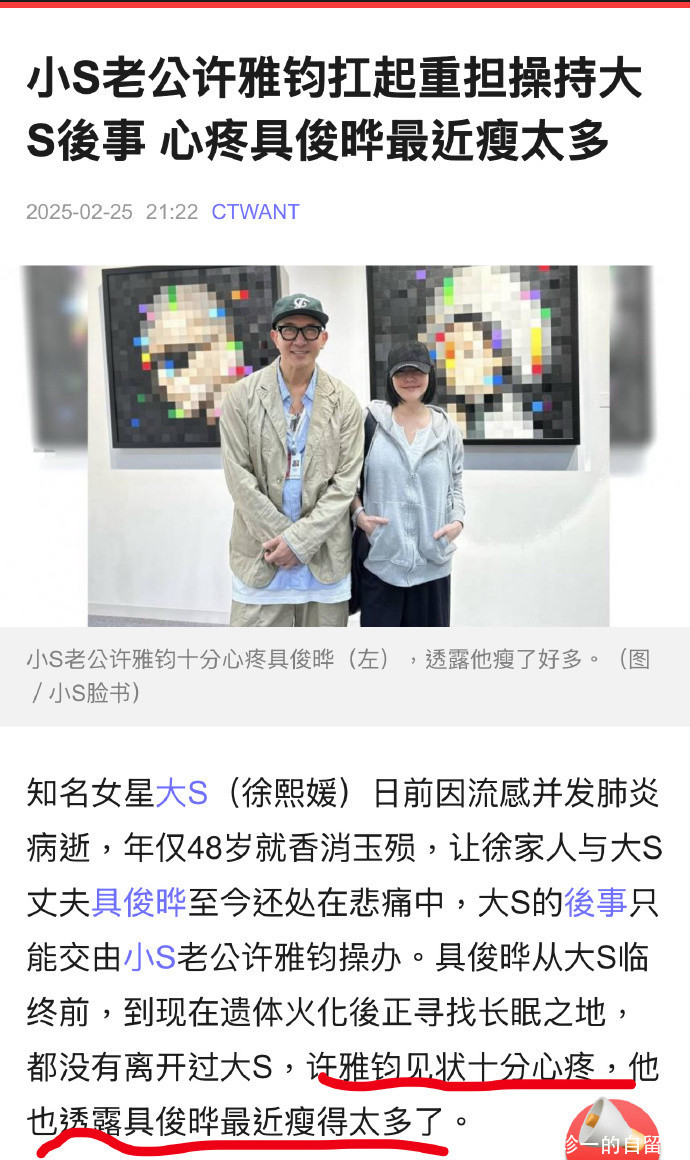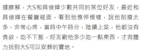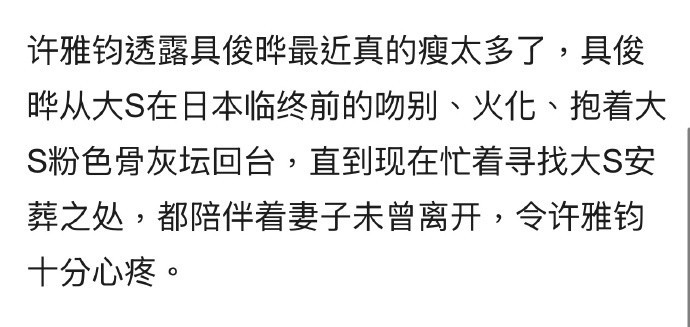 ![]() 大S离世之后,徐家的一举一动备受外界关注。 作为大S的现任丈夫,具俊晔的一举一动更是在聚光灯之下。 2月28日,关于具俊晔的近况曝光了。 台媒报道称具俊晔和朋友聚餐了。 台媒称这次和具俊晔聚餐的是具俊晔和大S共同的好友。 ![]() 这位好友接受台媒采访时说具俊晔模样憔悴,消瘦太多,非常令人心疼。 该好友还说当时是午饭时间,陆续上了很多菜,但具俊晔没有食欲,吃不下饭。 为了能让具俊晔吃点饭,好友劝慰他,对他说多少吃一点东西,才有体力找到大S可以安葬的宝地。 毫无疑问,好友的这句话说到了具俊晔的心坎里。 这段时间一直关注徐家的网友都知道,大S的骨灰还没有安置好。 ![]() 2月5日,大S的骨灰包机回台,当时徐家人说将大S的骨灰永久放置家中。 徐家这么做,主要有2个原因。 原因一,让小S能够随时见到姐姐,让她可以和姐姐说说话。 原因二,徐家人不想大S的骨灰被孤零零的放在灵骨塔里。 ![]() 不过,徐家的这一行为引发了争议,很多网友认为徐家的做法有违入土为安的传统。 最终在舆论的压力和邻居的投诉下,徐家改口称大S的骨灰将树葬。 ![]() 徐家的这一行为,依旧引发了争议。 在台湾树葬不设立墓碑,不记录姓名,若干年后,同一个地方还要循环利用。 在网友看来,这样做对大S的2个孩子太残酷了,以后他们想祭拜妈妈都没有地方可去。 甚至有网友揣测小S用心歹毒,质疑她要将姐姐挫骨扬灰。 ![]() 不过,在大S的树葬时间快要到时,具俊晔提出了反对。 他说想给大S找一个实体的地方,让他和徐家人想念她的时候,有一个地方可以去探望和祭拜。 ![]() 这是具俊晔第一次公开反对徐家人的决定。 最终在双方多次沟通之后,徐家放弃了树葬。 那么,大S的骨灰最终会如何安置呢? 台媒报道称大S骨灰的安置有两种方式。一种是找一个塔位,一种是找一块墓地,立一个大S的雕像。 至于最终选择什么方式,具俊晔还没有做出最终决定。 ![]() 可见,对于妻子的后事,具俊晔还是很上心的。 ![]() 而这次具俊晔好友曝出聚餐的情况,也印证了许雅钧所说的话,也让更多人相信许雅钧所说的话。 前几日,台媒称因为徐家人和具俊晔还处在悲痛之中,大S的后事将由小S的老公许雅钧操办。 彼时,接受台媒采访时许雅钧就透露了具俊晔的情况。 ![]() 他说从大S临终,到现在为大S找长眠之地,具俊晔一直没有离开大S。 这句话向外界传达了2个信息。 信息一,具俊晔并没有回韩国,之前网上有传言称具俊晔带着行李回了韩国,网友对此还热议不断。 信息二,具俊晔对大S的长眠之地很上心,一直在积极寻找。 ![]() 此外,许雅钧还透露了一个信息,他说具俊晔最近瘦了很多,令他心疼。 此次具俊晔的好友也提到,具俊晔消瘦太多,令人心疼。 具俊晔好友的话,证实了许雅钧所说不假。 实际上,这已经不是具俊晔第一次被说暴瘦了。 ![]() 前段时间,大S的第二场追思会举行,事后,大S的闺蜜贾永婕谈到具俊晔时说具俊晔很悲伤,她目测他瘦了12斤左右。 ![]() 通过这些亲朋好友的描述可知,大S的离世对具俊晔打击太大了。 对于一直关注大S和具俊晔的网友而言,具俊晔如今这样非常能理解。 毕竟他们兜兜转转那么多年才重新在一起,没想到结婚还没3年,就天人永隔。 而且大S对具俊晔在经济上没有什么要求,反而给予了具俊晔经济支持,在他的事业发展上提供帮助。 如今,爱妻猝逝,对于具俊晔而言,实在是人生无法承受之重。 希望他将大S的长眠之地早日找好,能够早日让大S入土为安,这也是他能为大S办的最后一件事情了。 明天和意外不知道哪个先来,也希望看到此文的读者注意身体健康,珍惜眼前人,拥有顺遂的人生。